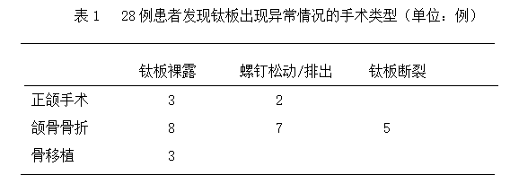 方法:對28例鈦板裸露、螺釘松動或脫落及鈦板斷裂患者的手術類型、手術時的情況,鈦板出現異常情況的時間等進行了回顧性分析與研究。