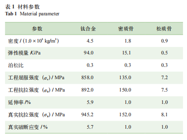 1.2.3??材料參數(shù)?? 2種醫(yī)用錨固釘材料均包括90%鈦、5.5%鋁、3.5%釩、1%碳、1%鐵、1%氮以及1%氧(表1)。