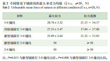 結(jié)果:三維有限元分析表明,傳統(tǒng)錨固釘和新型錨固釘所能承受的合力分別為48.8N和200.0N;配合3-0縫線使用的傳統(tǒng)和新型錨固釘在抗拉強(qiáng)度上比較,差異具有統(tǒng)計(jì)學(xué)意義 (P=0.033);此外,3-0縫線的傳統(tǒng)錨固釘和2-0縫線的新型錨固釘相比,差異也具有統(tǒng)計(jì)學(xué)意義(P=0.000)。